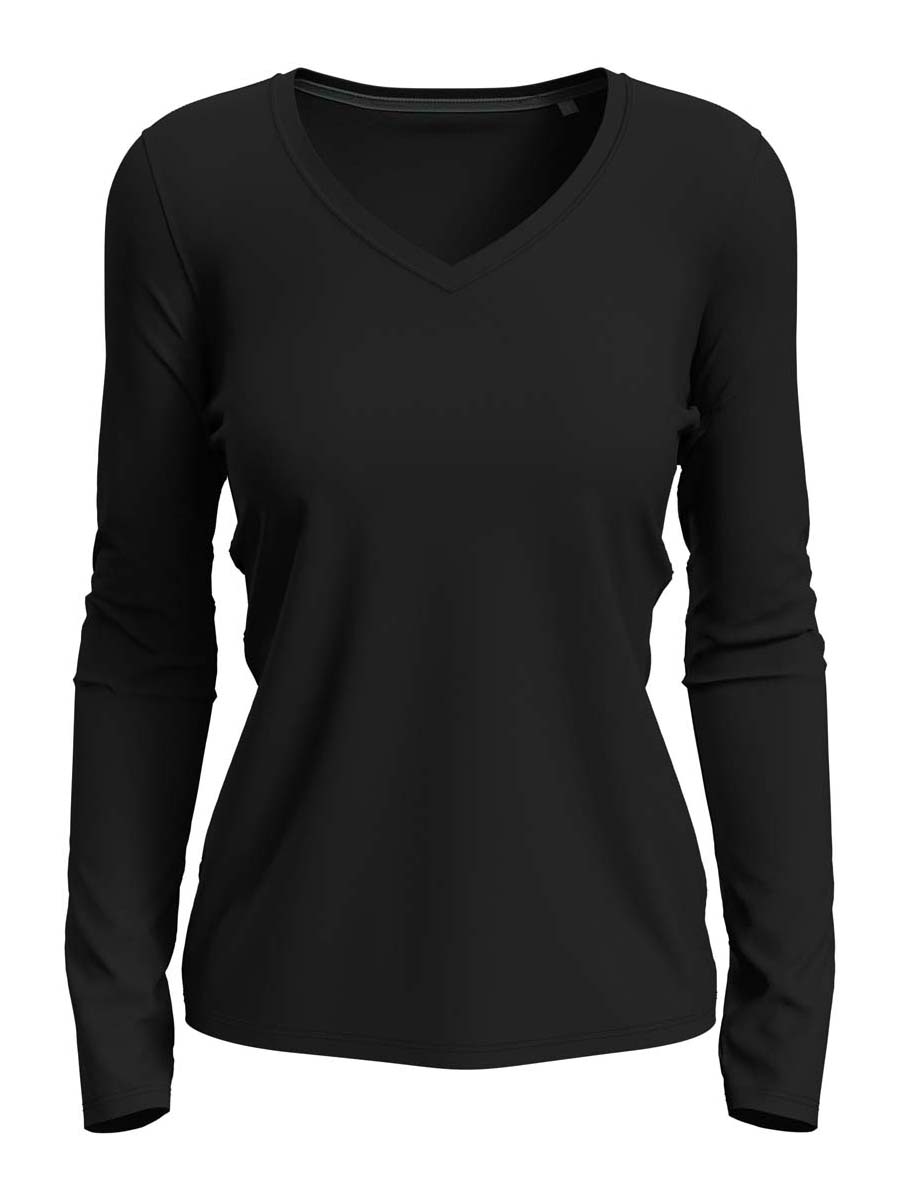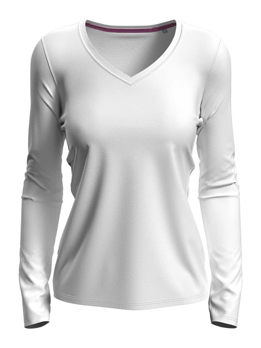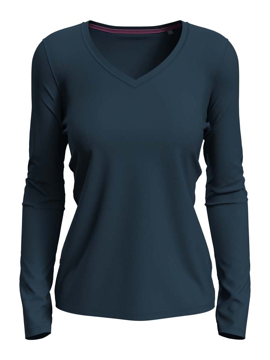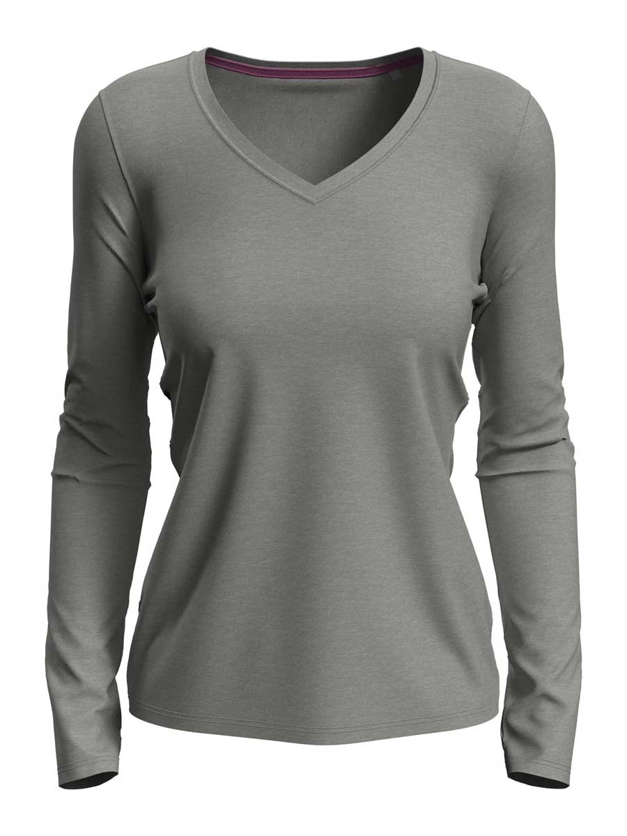 T-shirt aderente da donna a manica lunga in misto cotone-elastan, piacevolmente morbido, di lunghezza moderna, con ampio scollo a V e nastro di rinforzo in contrasto cromatico sul collo.